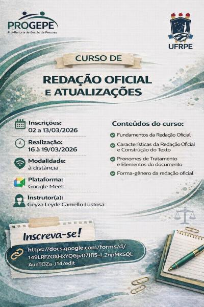 O curso será realizado pela PROGEPE e tem por objetivo como instruir os servidores em relação à elaboração dos documentos oficiais, conforme as normas vigentes, assegurando clareza, objetividade, correção linguística e alinhamento às novas diretrizes da administração pública. Além da adequação dos pronomes de tratamentos e a construções dos gêneros da redação oficiais mais utilizada nos setores da UFRPE. As inscrições serão realizadas no período de 04 à 13 de março de 2026, ou até o limite de participantes, por meio do preenchimento de formulário digital. O curso poderá ser utilizada para a compensação das horas do recesso do final do ano, conforme orienta a INSTRUÇÃO NORMATIVA 003/2025 (INSTRUÇÃO NORMATIVA 003/2025 - RECESSO E COMPENSAÇÃO FESTAS FINAL DO ANO | PROGEPE)