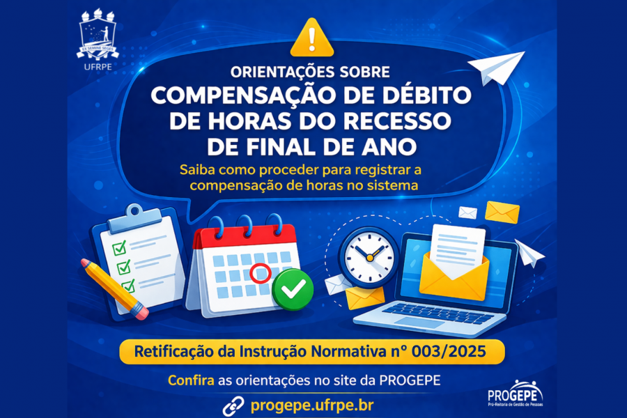 A Pró-Reitoria de Gestão de Pessoas (PROGEPE) divulga orientações aos(às) servidores(as) acerca dos procedimentos para compensação de débito de horas decorrentes do recesso de final de ano, quando realizada por meio de cursos de capacitação, participação em comissão de sindicância e/ou processo administrativo disciplinar (PAD), bem como pela atuação como secretário(a) ou membro de comissão de concurso ou seleção pública para cargo de professor.