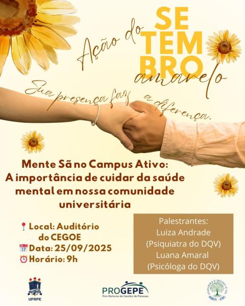 Em alusão ao Setembro Amarelo, o DQV/PROGEPE convida toda a comunidade universitária para um momento de reflexão e diálogo sobre saúde mental no ambiente acadêmico.