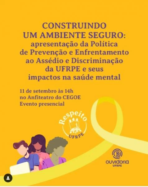 A UFRPE realiza, na próxima quarta-feira (11/09), o evento "Construindo um ambiente seguro: apresentação da Política de Prevenção e Enfrentamento ao Assédio e Discriminação da UFRPE e seus impactos na saúde mental." O encontro acontece no anfiteatro do Cegoe às 14h.
