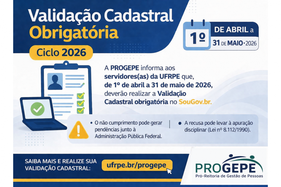 A Pró-Reitoria de Gestão de Pessoas (PROGEPE) informa aos servidores(as) da UFRPE que terá início, em 1º de abril de 2026, o ciclo anual da Validação Cadastral obrigatória, conforme orientações do Ministério da Gestão e da Inovação em Serviços Públicos (MGI).